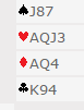 Svaret er vel 7 grand, vi har 37-38 hp, og da nytter det ikke å finne ut noe mer enn at det trolig er tretten stikk. Og det ble hva mange meldte uten å tenke særlig mer over det. Eneste bekymring kan være at makker har oppgradert en 19-poenger til 20, så har vi «bare» 36 poeng til sammen og kanskje mangler ett ess! Løsningen på det er å ta det litt rolig, for eks. melde Stayman (Puppet Stayman). Da kan du få satt en trumffarge (enn så lenge, du melder grand til slutt). For eksempel om makker sier 3 grand på 3 kløver kan du melde 4 kløver naturlig. Over et cuebid fra åpneren kan du så melde 4 grand for å forsikre deg om at det ikke mangler ett ess. Siden det ikke gjør det avslutter du med 7 grand. Hvis du har litt dårligere tid så melder du 7 grand direkte over 2 grand. Og slik alle kortene så ut tar spillet like liten tid som meldingsforløpet: