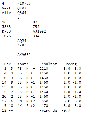 Over syds 1 grand gikk vest innpå med 2 kløver – begge major. Øst sa etter dobler fra nord 2 hjerter. Deretter var det nord som krevde og krevde før han til slutt plasserte syd i 6 grand.