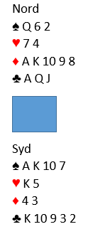 Syd åpnet med 1 grand (15-17). Det er nok en litt for overmodig oppgradering selv om det er en fin hånd. Jeg ser ikke den store oppsiden. Makker vil ofte til å bringe oss for høyt, og eneste oppsiden med en sånn oppgradering er at kanskje den i så fall for hardt meldte kontrakten vi havner i kan spilles hjem - tross alt har syd stikkpotensiale. Akkurat sånn var det faktisk.