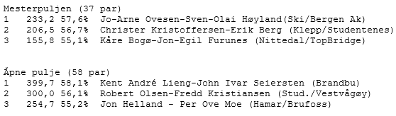 Ved åtte av 16 bord i mester ble resultatet +1430 til N/S. Vinnerparet satt Ø/V imot sparutgang og noterte +680 til N/S etter hjerterutspill, og det ga +9 til Ø/V. Toerne fikk motsatt skjebne da de satt N/S og spilte 5 spar med tolv, -9. Ved kun to bord fikk Ø/V tatt kløverstikkene, og de N/S parene som noterte +650 følte seg vel litt robbet da de måtte dele bunn for det, etter å ha gjort det teoretisk riktige, ikke melde slem. ,