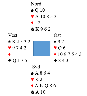 Vest server ut makkers meldte farge med en liten spar, som du vinner med esset. Så spiller du dama i hjerter, vest følger med 10'eren, øst med 5'eren. Overraskelsen kommer i neste stikk da det viser seg at øst har starta med 5 hjertere og vest nå er renons. Øst gikk for sikkerhets skyld i med 8'eren for å sikre at du brukte honnør.
