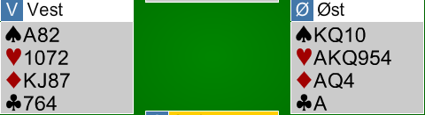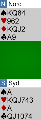 Her var det sannelig store kort! Etter pass fra nord åpner øst med 2 kløver ifølge vanlig system. Vest melder 2 ruter som er "waiting", dvs. det kan godt være en positiv hånd hvis den er balansert. Øst sier 2 hjerter (2 kløver er utgangskrav), og vest løfter til 3 hjerter som er sterkere enn 4 hjerter i denne posisjonen. Da kan øst gå i 4 grand, men han kan også ta det litt roligere og melde 4 kløver - kontrollmelding. Vest kontrollmelder i så fall 4 ruter, og da kommer 4 grand fra øst. Vest viser ett ess, og da er det storeslem på gang! Øst fortsetter imidlertid sine undersøkelser med 5 grand. Det viser storeslemsinteresse og ber makkeren melde en konge om han har det, og her kommer 6 ruter - ruter konge! (vest bør vise ruter konge selv om han har kontrollmeldt ruter, for makkeren behøver ikke vite at 4 ruter innebærer kongen). Etter dette vet øst nok, vest har vist spar ess, ruter konge og hjerterstøtte! Så da kan vel øst melde 7 hjerter? Nei, det er en stor feil i parturnering. Her er det tretten stikk fra topp, og det bør meldes 7 grand for å få med det lille ekstra.