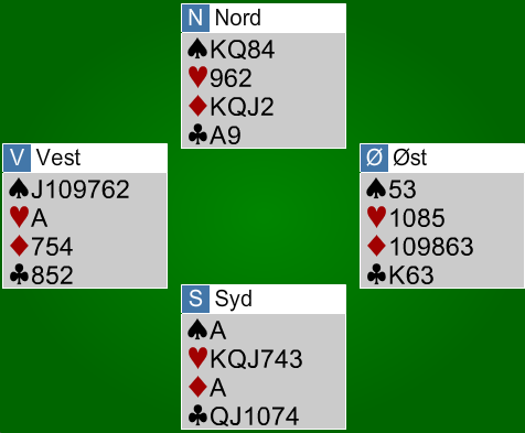 Som du ser følger øst som har de to uteværende trumfene behagelig hele tiden i ruter. Dermed gir tre ruterstikk tre kløveravkast, og på spar konge forsvinner syds siste kløver - vunnet kontrakt. Sånn går det om spillefører altså går opp med kløver ess og begynner å ta ruterstikkene først. Hva skjer om spillefører starter med K-Q i spar som kanskje ser naturlig ut? Spar konge gir ett kløveravkast, men øst kan sette i en trumf på den siste sparhonnøren. Det gjør imiderltid ikke noe, syd trumfer over og tar for en stor trumf som etter dette tar ut øst sin siste trumf. Da er hjerter 9 inntak til nord, og der er det tre ruterstikk som gir avkast for de resterende tre kløverne hos syd.