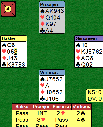 Verdensmester (2011) Luuk Verhees var i 4 spar og fikk hjerter ut fra Christian Bakke, til liten, sekseren og esset. Nederlenderen startet bra med å slippe rundt kløver 10 til østs dame. Tilbake kom kløver.