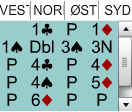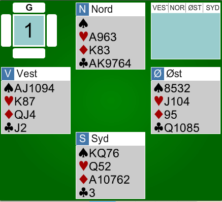 Nord hadde meldt omtrent som om han hadde stjålet kortene, men lilleslemmen var ikke helt håpløs. Spesielt ikke etter spar ess i utspill! Utspillet ble trumfet, og syd hadde fått godspilt to stikk i den fargen. Det var fortsatt ikke så lett å se hvordan dette skulle bli tolv stikk. Det kan se ut som om det kan gå an å spille god kløverfargen, men da må det stjeles to ganger hos syd, og det blir litt problemer med overgangene for å få hentet stikkene på begge sider. Men Huang viste sin klasse og spilte nesten som om han visste kortene - perfekt timing. Fortsettelsen var kløver ess og kløver til stjeling, ruter ess og ruter til kongen. Da var dette igjen: