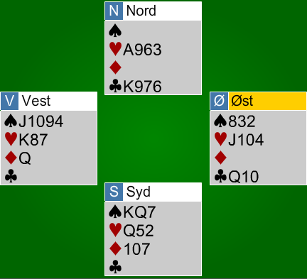 Kjell Ola og Oddgeir var ute med åtet i spillet under, og selvfølgelig bet redaktøren på med hud og hår. Meldingsforløpet og sluttkontrakta burde vi gå forbi i stillhet; vi kan jo for all sømmelighets skyld si at Foss-Åsgård stilfullt bremsa opp i idealkontrakta 2NT, med undertegnede som spillefører. Her plassert i syd, og utspillet er hjerter-knekt fra Kjell Ola: