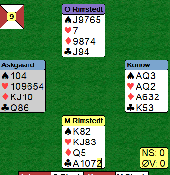 Øst var spillefører i 3 grand, og syd spilte ut en liten kløver som fikk løpe til østs konge. Konow gikk i gang med hjerteren med esset fulgt av damen. Syd vant med kongen og spilte kløver ess og mer kløver som satte opp syds fjerde kløver. Konow fortsatte med hjerter 10 til syds knekt, og han tok kløverstikket sitt, forsvarets fjerde stikk. Syd fridde seg med sin fjerde hjerter.