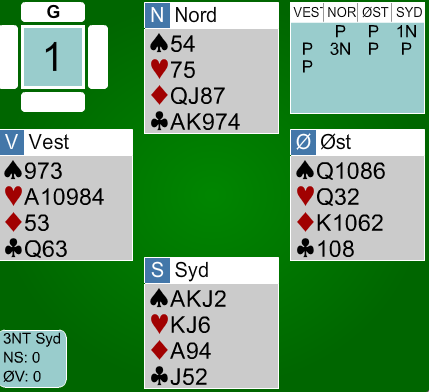 Jeg fant ut at om øst hadde kløver dame tredje fra start så kunne han godt blir utsatt for en fin skvis om vest fikk lov å ta alle hjerterstikkene sine. Derfor hjerter, og vest fikk komme inn. Håpet var at det satt omtrent slik fra start:
