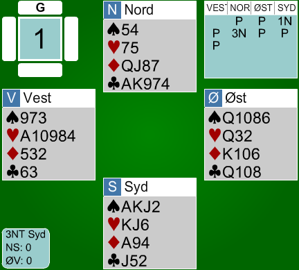 Vi som ser alle kortene har ingen problemer, vi tar ruterfinesse riktig vei og vinner utgangen. Men dansken som kun så sine egne kort og blindemanns tok sparfinessen og gikk bet. Hvilken finesse som lykkes er vel hipp som happ, så spillefører kan kansjke ikke klandres?
