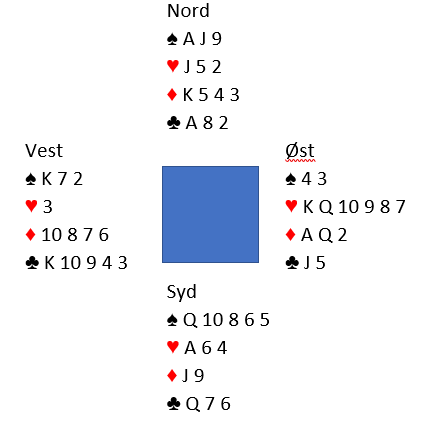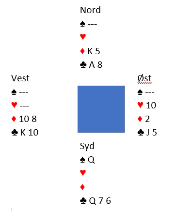 Vest spilte ut sin single hjerter til liten, nieren og esset. Det fulgte spar til nieren, så hjerter fra bordet. Om det skulle være noen sjanse til i alle fall åtte stikk måtte motparten gjøre noe feil i motspillet. Øst tok sine to hjerterstikk og spilte trumf som gikk til knekten, så spar ess. Da fulgte liten ruter fra nord, og øst tok for damen. Nå så det nokså naturlig ut for han å presse syds trumf med hjerterspill. Syd stjal med den nest siste trumfen, så ruter knekt som øst stakk med esset. Dette var igjen: