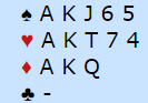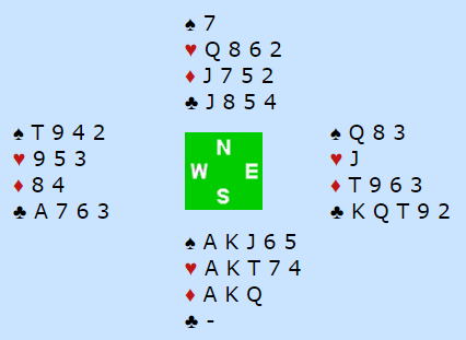 Pluss 1510 for 7 hjerter med tretten var uavgjort i en rekke kamper, men mange andre meldte bare lilleslem. I vår kamp stoppet de i 6 hjerter ved vårt bord, et spill du kan håpe gir plusscore, men kanskje blir det uavgjort. Men vår australske venn hadde et svakt øyeblikk og endte i ugang! Dermed tapte vi 10 imp på at motparten meldte "bare" lilleslem i stedet for å vinne 11 imp, og 21 imp i sving i en kamp som endte uavgjort koster spillet over 5VP.