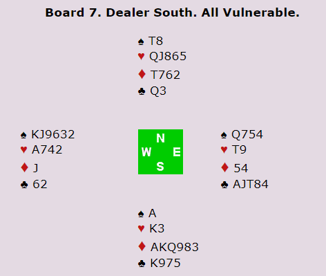 Vi har ikke fått fatt i meldingsforløpet i U-26 kampen, men må anta at vest var innpå og meldte spar, og at kanskje øst støttet. I så fall så har jo syd sparstopper, og seks sannsynlige stikk i ruter. For at 3 grand da skal stå må makkeren har enten hjerter- eller kløver ess. Her ble det veldig feil å satse på 3 grand som Norges N/S par-gjorde. Det kom spar ut, og da er det beste spillefører kan gjøre å ta sine syv stikk for to bet. Da spillefører forsøkte å spille god stikk før han hadde tatt sine egne ble det for sikkerhets skyld tre bet, -300. Da Hellas fant frem til 5 ruter og noterte en enkel +600 ble det kampens største svingspill, 14 IMP til Hellas.