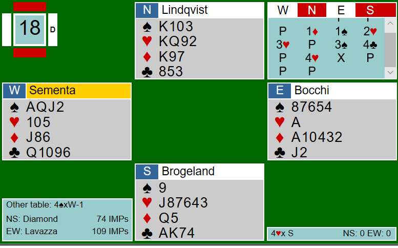 Ved det andre bordet gikk Platnick-Diamond en bet i 4 spar doblet. Med denne type kort er det litt uvanlig å la N/S få spille 4 hjerter som italienerne gjorde mot Brogeland-Lindqvist, men det kan se ut som om det er riktig av Ø/V å gjøre det i dette tilfellet siden 4 spar går bet, og det tilsynelatende er fire tapere (en i hver farge) i 4 hjerter. Men det er et lite synsbedrag. I alle fall er det vanskelig for forsvaret etter at vest har spilt ut spar ess som Sementa gjorde. I andre stikk skiftet han til ruter knekt, liten fra nord. Da oppstår en variant av det som kalles "Mortons fork". Hvis øst ikke tar for ruter ess kan det kastes ruter fra syd på spar konge. For hvis øst legger liten vinner ruter dame stikket, så trumf. Øst er inne på hjerter ess, og tar han ikke for ruter ess da så får ikke forsvaret ruterstikk, syds andre ruter forsvinner på spar konge. Det hjelperimidlertid ikke å ta for ruter ess verken i fargens første runde, eller om han legger liten i det stikket og kommer inn på hjerter ess i neste stikk. For tas ruter ess "på luft" får spillefører to ruterstikk, og han har plutselig to avkast, ett på nords spar konge og ett på ruter konge. På de forsvinner syds to små kløver.