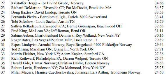 Under Summer Nationals i Toronto har det blitt spilt parturnering noen dager - Von Zedtwitz Life Master Pairs - og søndag skal finalen avgjøres. Av de 78 parene som kvalifiserte seg til den var det fire par med norske spillere, og best av de etter semifinalen var Kristoffer Hegge-Tor Eivind Grude på 22.plass.