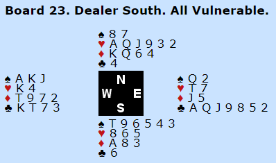 Merk at slik som kortene sitter fordelt kan N/S vinne 4 hjerter med sine 16 hp. Ved begge bord var det imidlertid Ø/V som fikke spille utgang. New Zealands vest var i 4 grand og nord skulle spille ut. Han valgte ruter dame, og da gikk motspillet fort etterpå. Syd kom inn på ruter ess i andre stikk og skiftet til hjerter gjennom vests konge. Frankrike tok seks hjerterstikk og tre i ruter, seks sonebet!