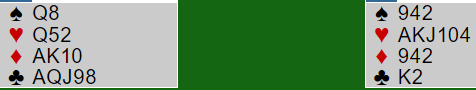 Merk at Ø/V med slike kort normalt har tolv stikk med ethvert annet utspill, selv om denne gangen så satt kløveren 5-1. Kløverutspill gir tolv (fem kløverstikk).