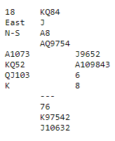 Pass blir for tamt. 2 hjerter og 3 hjerter er begge alternativer. Hvis øst gjør det står N/S i fare for å bli utmeldt da nord får en ekkel meldeprøve idet vest hopper til 4 hjerter. Men han bør vel askjonere på en eller annen måte, kanskje dobler (ikke så fristende med dobbelton ruter). Om nord ikke finner noen melding bør vel syd komme tilbake med 4 grand, kanskje, men det er tross alt i ugunstig sone. Ved ett bord ble Ø/V (Hogstad-Øberg) spillende 4 hjerter med +420 (bør vel ikke vinnes, men...), til tross for at N/S kan vinne 6 kløver!