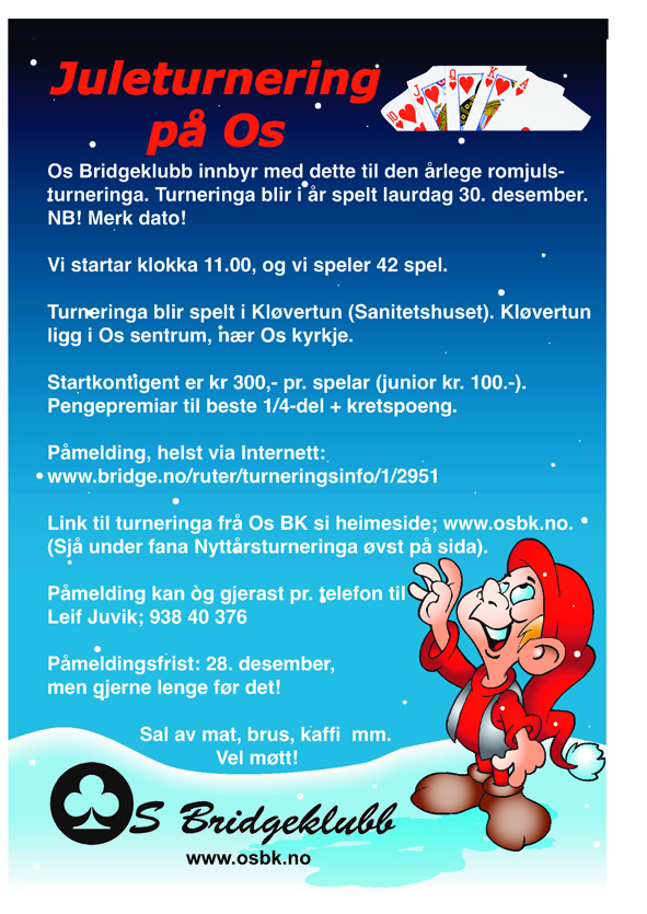 Innbydinga til juleturneringa vår er klar. Laurdag 30. desember er dagen i år, Sprei gjerne innbydinga rundt til alle som kan vera interessert. Klikk biletet for pdf-versjon.