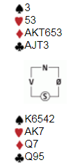 Du har blitt spillefører i 3NT i syd, og får en liten hjerter ut til knekten og kongen. Planlegg spillet videre.