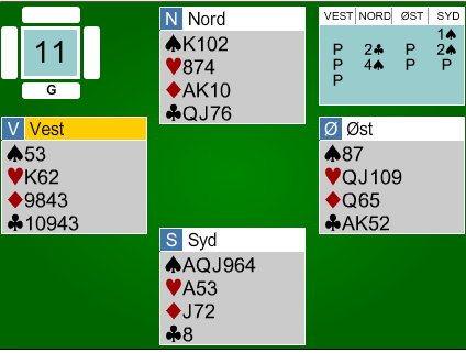 Syd er i 4 spar uten motmeldinger. Vest spiller ut kløver 10 til damen og østs konge. Derfra kommer hjerter dame tilbake. Det kan se ut som om det blir to hjertertapere slik at kontrakten er avhengig av ruterfinessen. Men det er kun om du ikke har fått med deg hvordan nords "små" kløver har vokset verdi. Ø/V har nå igjen kun esset og nieren i kløver, og det bør spillefører utnytte. Det han bør gjøre er helt gratis!