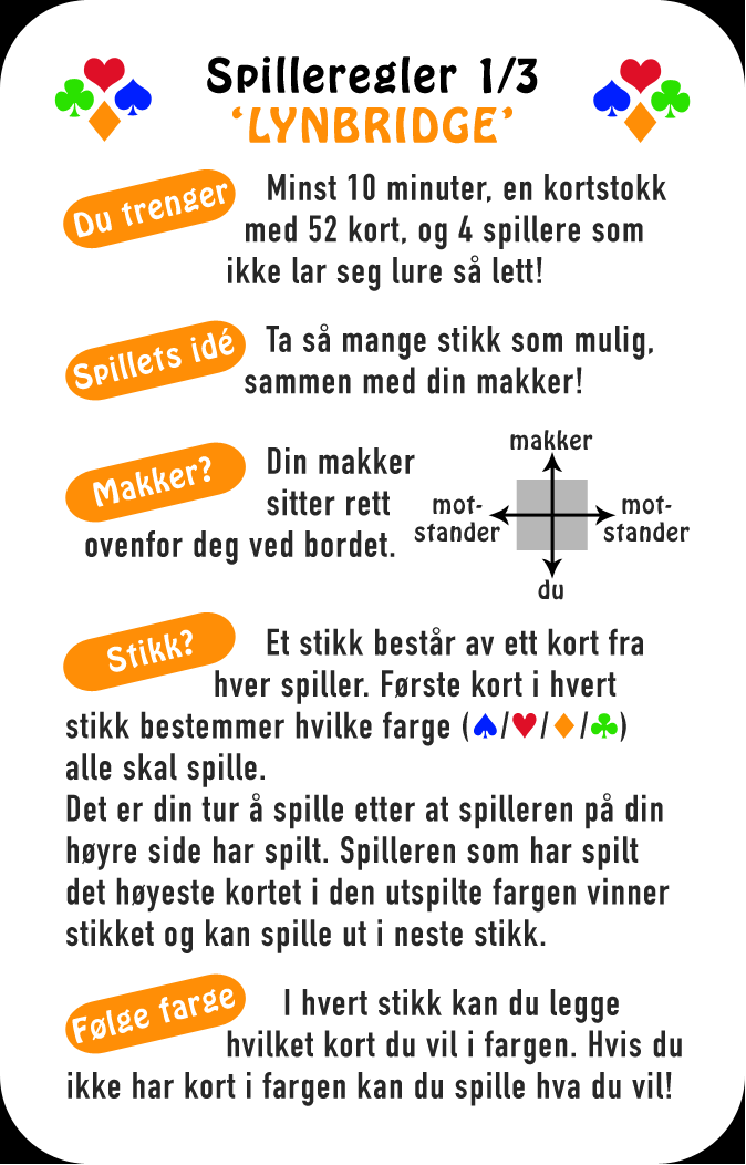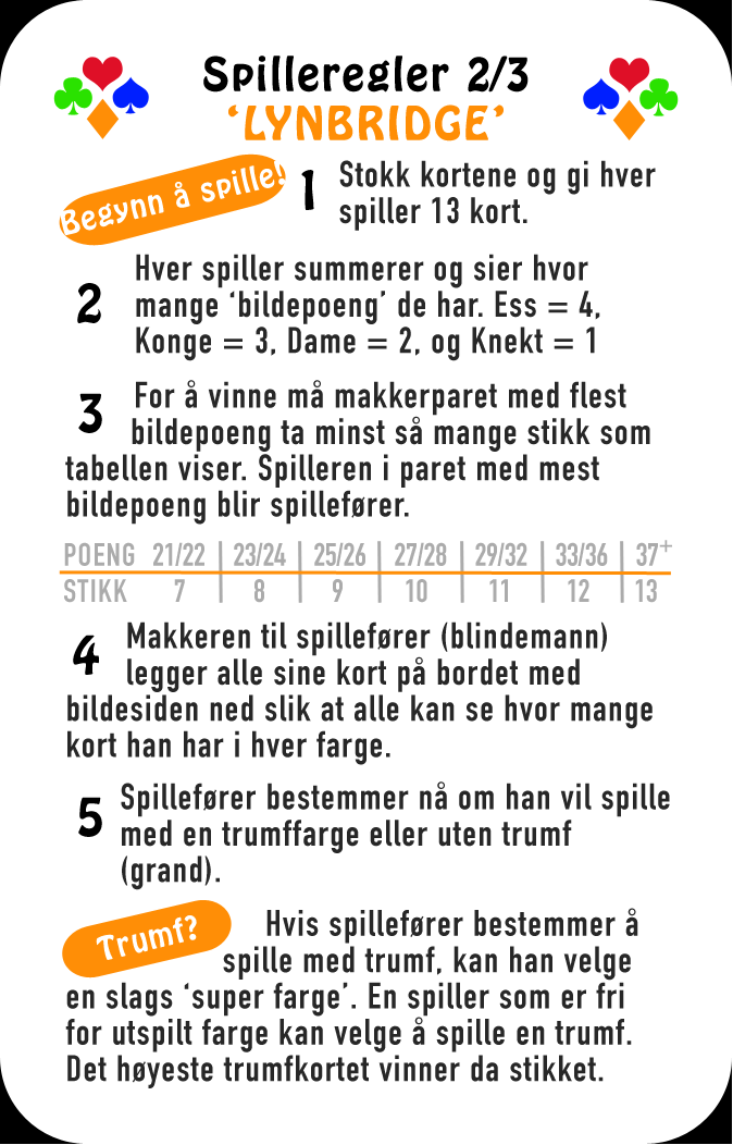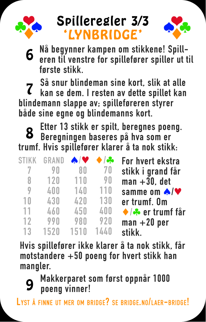 Lynbridge fokuserer på spillet, så meldedelen er svært forenklet. Etter at det forenklete meldingsforløpet er over, er spillet helt likt vanlig bridge. Kurset passer alle aldere.