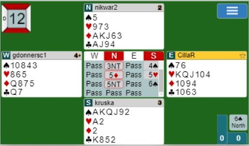 Her er det faktisk slik at i lagkamp er det god bridge å få kun tolv stikk i 6 spar for å sikre seg kontrakten selv om det er enkelt å se at det kan bli tretten stikk når en ser alle kortene!