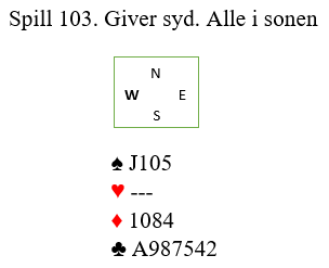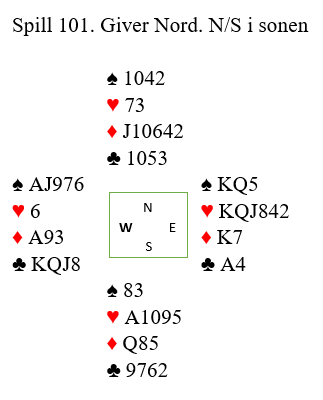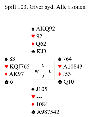 Og hjerter kom ut fra vest, men da nieren ble lagt fra nord feilet øst og la i damen. Det er riktig motspill kun om utspillet er liten fra AKxx(x). Å legge liten koster ikke stikk selv om syd har A-x hvor i så fall nieren vinner stikket, for da får han etter hvert to stikk i fargen om øst legger i damen også. Legges liten hjerter fra øst har forsvaret enkelt minst fem stikk.
