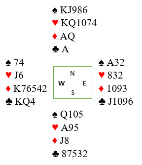 Kløver knekt kom ut til esset. Spar 9 i neste stikk vant stikk, så spar som øst tok med esset. Vest fulgte to ganger, og øst fridde seg med sin siste trumf til syds dame. Ruterfinessen ble tatt og holdt, og du lurer kanskje på hva som er problemet nå?