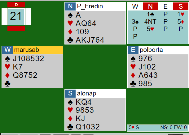 Sørafrikaneren Alon Apteker (syd) ble spillende 5 hjerter etter en aggressiv melding (4NT) av Peter Fredin (nord), men vests var også aggressiv! Hans 3 spar gjorde at nord måtte ta en avgjørelse, og det var liksom ikke rom for å kunne avgi en sleminvitt. Derfor tok han en sats, men fant ut de manglet to nøkkelkort (i hjerterkontrakt) så de bråstoppet i 5 hjerter.