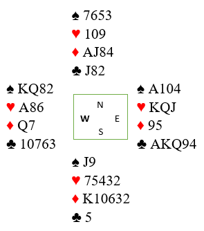 «Regelen» for å spille tilbake i utspilt farge er altså norsk fra gjenværende, og det tilsier ruter 4 her. Men i dette tilfellet bør nok nord gjøre unntak og gjøre det enkelt med å spille ruter knekt i andre stikk. Og det er ikke bare for å gjøre det enkelt, det kan sitte slik at det er blokkering i ruter også. Husk makker har normalt fem ruter (norsk fordelingsutspill). Ved noen bord der fireren ble spilt tilbake gikk det galt, men det burde ikke gått galt likevel slik fargen så ut. Slik så hele spillet ut: