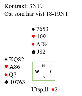 Han har enten to eller fire fra start. Hvis han har fire har han en stopper uansett, og med J-9-8-5 ville/burde han også lagt lavt fra bordet i første stikk. Altså er det omtrent 100% sikkert at øst hadde dobbelton ruter fra start, og da er det vel helt logisk at det bør spilles liten ruter i tredje stikk?