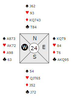 Ved mange bord startet det med 1 grand fra vest (15-17). Øst har 14 poeng, og det er litt i minste laget for slem, for de har maksimalt 31 poeng til sammen. Men østs hånd er god, ikke noen hvilken som helst 14 poenger. Og det er jo slik at bridgespill avgjøres ikke av antall HP, men antall stikk!