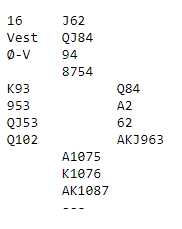 To par endte i 6 grand spilt av nord, Berset-Ekren (BAK) og Grime-Sundeng (Vikersund). Det må være lov å si at det er en nokså tøff lilleslem. Hvis det kommer hjerter ut må «alt» sitte, da tåles ikke at en finesse går galt. Men ved begge bord hvor 6 grand ble kontrakten unngikk spillefører hjerterutspillet og hadde litt bedre tid.