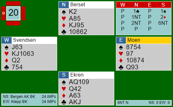 Begge parene som var i 6 grand vant den. Det ga 12 IMP siden det ble spilt 3 grand med tretten ved de andre bordene (hjerterutspill fra vest).