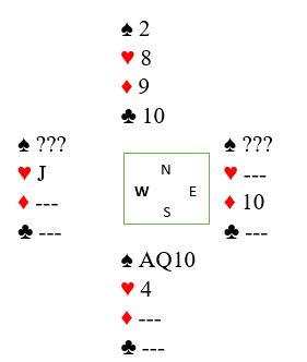 Idet kløveren testes ser spillefører at den trettende kløveren står. Hvis det så spilles ruter ess og ruter til knekten oppdages at øst har igjen ruter 10. Så spilles kløver 10 med disse kortene igjen: