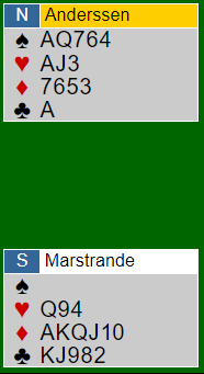 Jeg stusset litt på dette spillet, hvor de internasjonale toppspillerne Joe Grue (syd) og Sandra Rimstedt (nord) bommet på et motspill som ingen andre andre problemer med. Det var Gunn Tove Vist som var den heldige (vest), og hun hadde sammen med makker Christian Bakke havnet i 4 spar som de aller fleste andre Ø/V-parene.