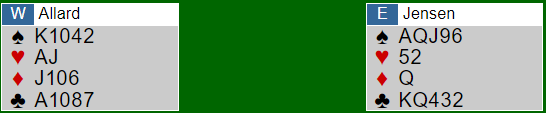 Også i dette spillet var tre av åtte par i slem. Allard-Jensen noterte +1430 for Vikersund. Underveis i meldingene avga vest en kontrollmelding i hjerter, og nord doblet. Da passet øst for å finne ut om det var første- eller andrekontroll vest hadde, for om vest hadde hatt K-x i hjerter ville slem vært farlige greier med dobling av hjerter bak kongen. Vest redoblet som i en sånn situasjon viser esset. God informasjon for øst som deretter gikk på til slem via Key-Card Blackwood.