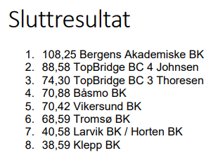 Bergen Akademiske BK (Bakke - Charlsen og Berset - Ekren) vant NM-finalen for klubblag suverent. På de neste plassene fulgte TopBridge Johnsen (Johnsen - Stokkeland, Furunes - Mikkelsen og Aaseng - Johansen) og TopBridge Thoresen (Brandsnes - Thoresen, Høyland - Ovesen og Fasting - Lie). Aaseng - Johansen ble nummer 2 på butleren. Lenke til resultater