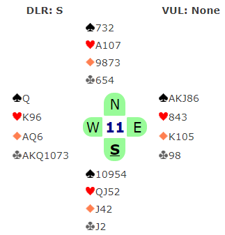 Meldingene kunne kanskje med fordel gått litt annereldes enn de faktisk gikk, men Sjoert og Vicky hadde ikke lange systempraten før kampen. Etter at øst hadde lurt seg innpå med 2 ruter endte Brink i 6 hjerter som nord. En bedre slem er 6 kløver som ble meldt og vunnet ved et par bord. Om en ser kun på N/S sine kort er ikke 6 hjerter noen dårlig kontrakt heller, og oppgaven var altså å spille hjem den kontrakten. Vest spilte ut ruter dame til esset.
