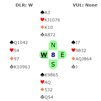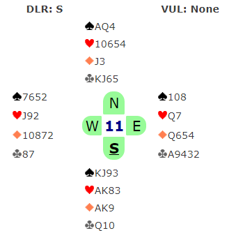 Selv om N/S forsøker seg litt mer bør det i alle fall kunne stoppes i 5 hjerter da Key Card Blackwood vil avsløre at det mangler både ett ess og trumf dame. Det er selvsagt mye bedre å stoppe i 4 hjerter siden 5 hjerter kan gå bet om hjerteren sitter skjevt. Her var det imidlertid elleve toppstikk, +450.