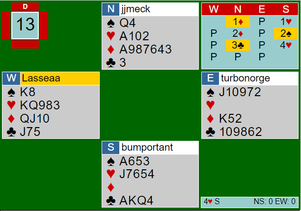 Rodwell var i 4 hjerter hvor det som du ser sitter grusomt. Uten å ha peiling på den skjeve trumfsitsen er det ikke lett, men kontrakten kan vinnes. Rodwell fikk ruter dame i utspill fra Aaseng. Rodwell stakk med esset og kastet en spar. Så valgte han en uheldig spilleplan selv om det er mye lettere å se at det blir feil når en ser hele kortleiken. Han spilte kløver til esset og liten spar mot damen. Aaseng stakk og spilte en listig liten trumf! Det er bra motspill, for vest ser jo at at spillefører har tenkt å trumfe kløver/spar hos nord, og da er det ikke lett å slippe trumfskiftet som kanskje går til honnør hos øst fulgt av nok en trumf hvoretter det blir for mange tapere, og kanskje bet selv om trumfen sitter 3-2!