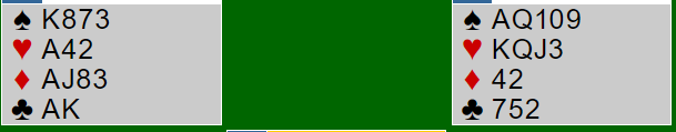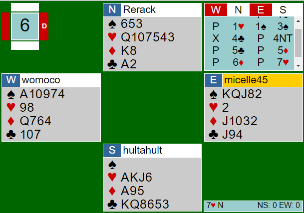 Av de 30 N/S parene meldte 14 av dem 7 hjerter i spill 6, noe som bekrefter at nivået er høyt i denne turneringen! Det var imidlertid to par i utgang også, mens 14 N/S-par spilte lilleslem i hjerter.