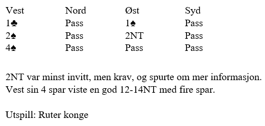 Svein sitter nord med denne hånda. Vest åpner 1 kl før ham, øst melder 2 kl som naturlig utgangsinvitt (omvendt minor). Vest melder naturlig 2 NT og øst inviterer til lilleslem med 4 NT. Der stopper det opp, og Svein skal nå spille ut.