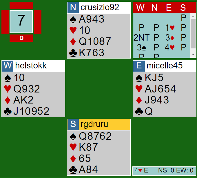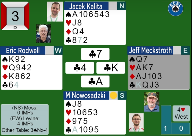 Meckstroth (øst) doblet, og Rodwell (vest) sa 4 hjerter som han fikk spille.