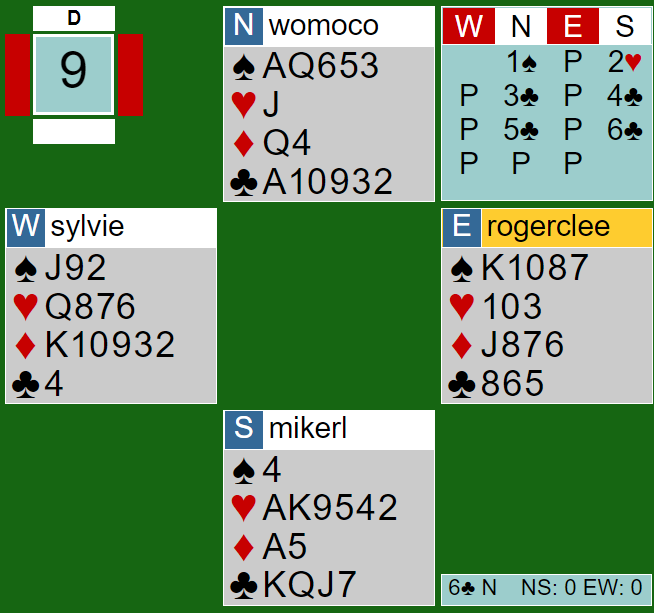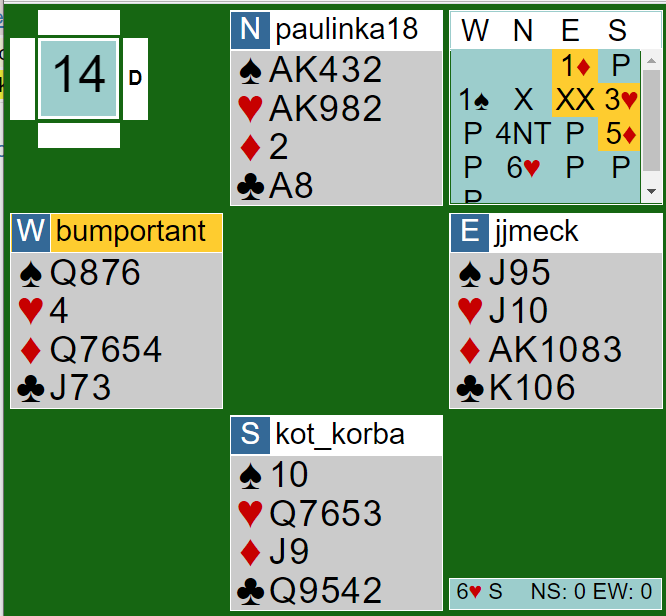 Men Rodwell skulle spille ut mot 6 hjerter etter hans makker hadde åpnet med 1 ruter etter PRESISJON, og det lover ikke ruterfarge. Øst redoblet så i andre melderunde for å vise trekorts spar. Etter at Nowosadszki-Kalita hadde klatret til 6 hjerter var ikke ruterutspill opplagt.