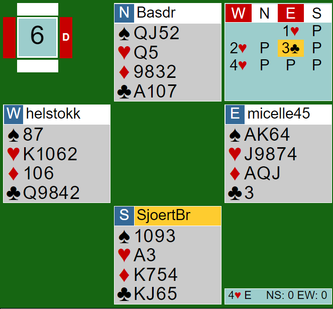 Nord hadde et vanskelig utspill. Da han valgte kløver ess – umeldt farge – ble det veldig lett spill, og Helness fikk til slutt hele elleve stikk, +660.