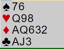 Så to spill fra tirsdag. Dere kan gjerne ta dem som meldeprøver. Først et spill der Arne Marthinussen (N)- Fred Hansen (S) klarte brasene godt. Nord giver i gunstig sone.
