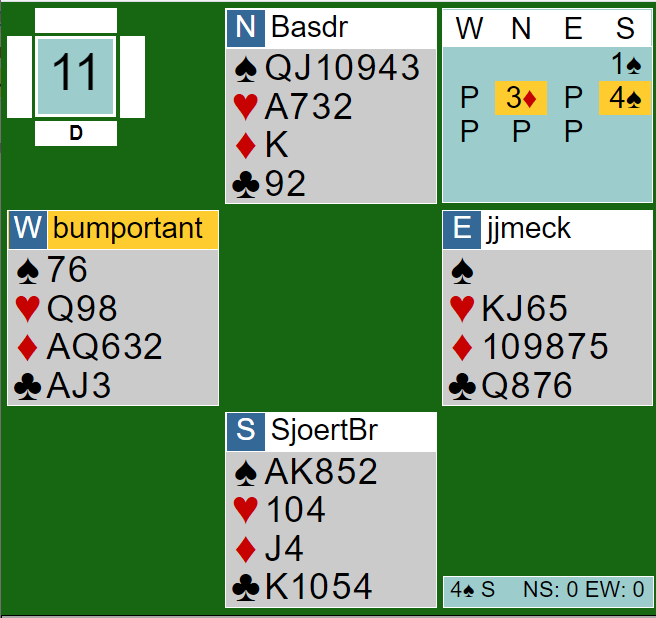 Vest kunne ikke si 3 kløver slik de spiller da det viser tillegg. Over 3 hjerter hadde vest et valg, støtte ruteren, eller si 3NT. I 5 ruter er det bet om syd finner kløver ut.