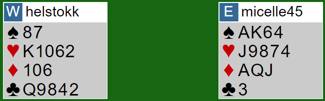 Øst (Helgemo) åpnet, og N/S meldt ikke annet enn pass. Ved begge bord ble øst spillefører i 4 hjerter. Og syd spilte ved begge bord ut liten kløver til nords ess fulgt av skift til spar 2 til esset.