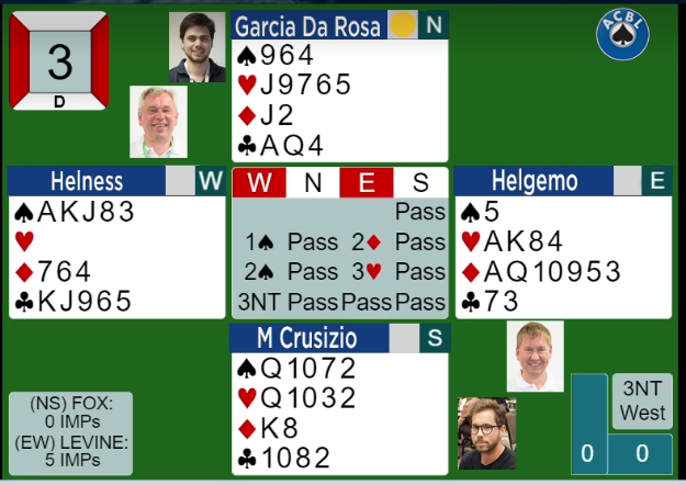 I semifinalen møter LEVINE lag FOX og det norske parets lag var nok klare favoritter før kampen. FOX gikk imidlertid hardt ut og tok ledelsen i det første av fire sett. De økte faktisk ledelsen i andre sett og halvveis ledet de med 32 IMP. Så i det tredje settet var lag LEVINE sin line-up Helness-Helgemo og Meckstroth-Rodwell. Som så ofte før satte de på turboen, og allerede etter fem spill hadde de tatt ledelsen med 40-0, og var plutselig foran med 7 IMP totalt.